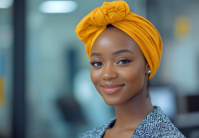 Femme africaine souriante en tenue traditionnelle sur un fond jaune