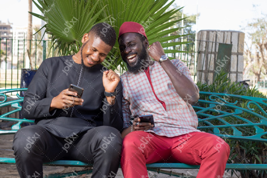 Deux hommes africains heureux assis dans le parc tenant un smartphone