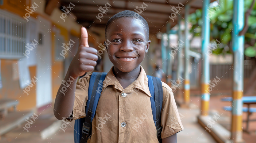 Petit garçon africain en uniforme scolaire avec son sac à dos levant les deux pouces