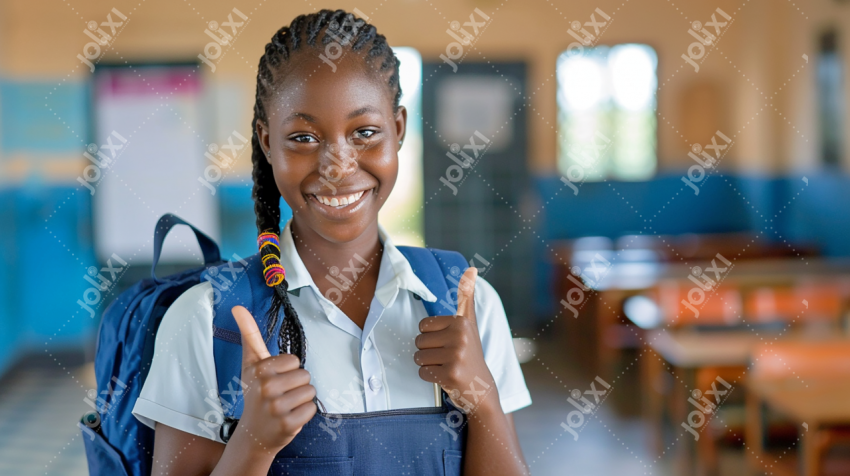 Belle écolière africaine contente en uniforme scolaire levant les deux pouces pour dire super