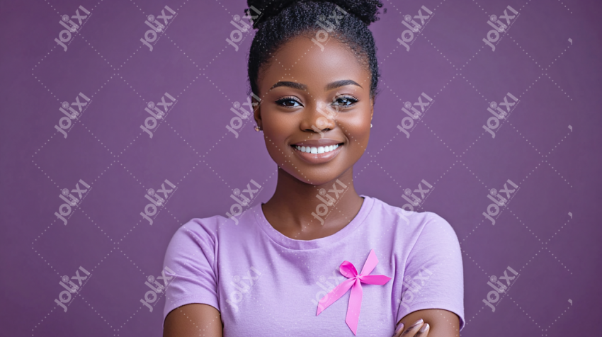 Femme africaine avec rubans des roses pour la sensibilisation au cancer du sein fond de studio violet / Octobre rose