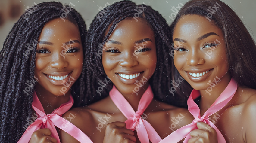 Trois Femme africaine avec rubans roses pour la sensibilisation au cancer du sein / Octobre Rose