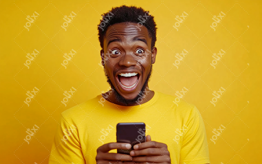 Homme africain tenant un téléphone portable dans les mains avec un regard étonnant