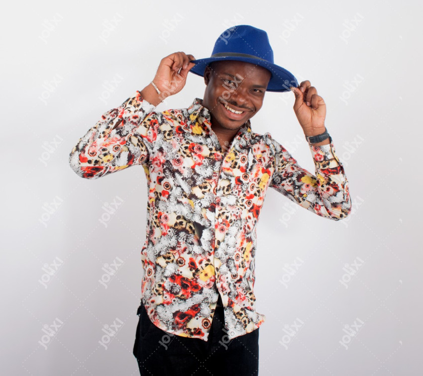 Bel homme africain en joie attrape son chapeau en tête
