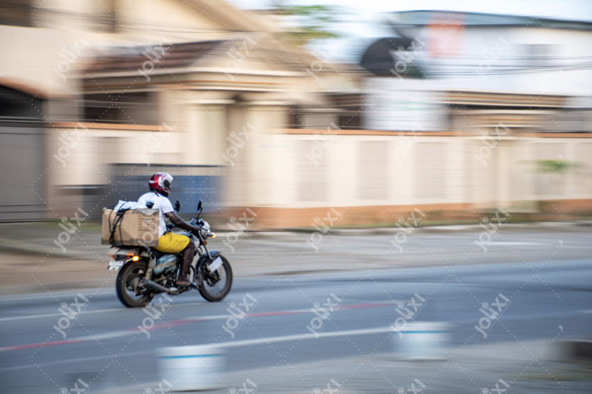 un livreur à moto en plein mouvement dans les rues de la ville. L’effet de flou de mouvement donne une sensation de vitesse et d’urgence, typique des services de livraison modernes dans les métropoles africaines. Le cliché illustre parfaitement la montée du e-commerce, des startups logistiques et l’importance des motos-taxis dans le tissu économique urbain.