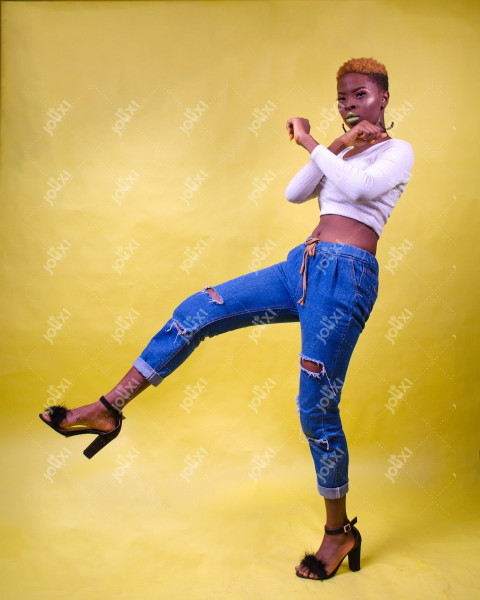 Femme africaine en joie faisant faisant un geste d'appel sur un fond jaune