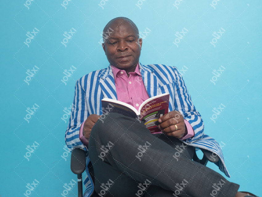 Petit garçon africain en uniforme scolaire tenant entre les main un livre ouvert sur un fond blanc
