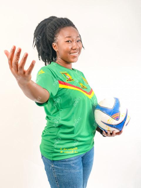 Jeune femme africaine célébrant sa joie portant un maillot des Lions indomptables du Caméroun tenant un ballon sur un fond blanc