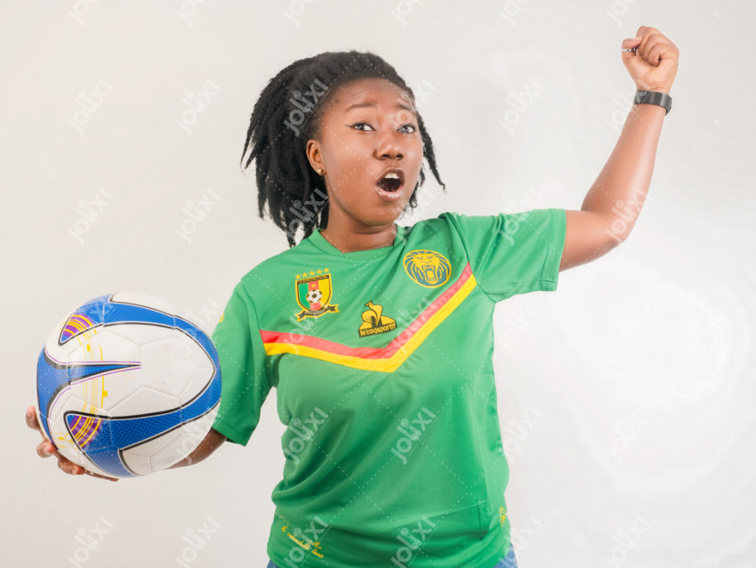 Jeune femme africaine célébrant sa victoire tenant un ballon portant un maillot camerounais sur un fond blanc
