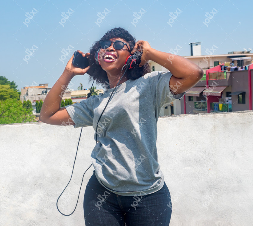 Jeune femme africaine en gaité avec des cheveux bouclés touchant son casque à musique à l'exterieur