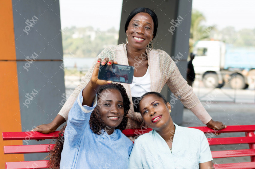 Femmes africaines souriante en tenue traditionnelle manipulant leurs smartphones sur un fond beige
