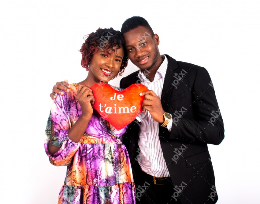 Couple africain amoureux content en pagne avec un cœur et une rose
