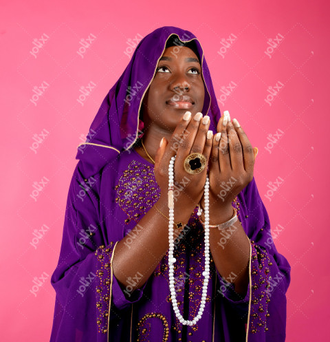 Femme africaine musulmane soulevant sa main avec le chapelet sur un fond rose