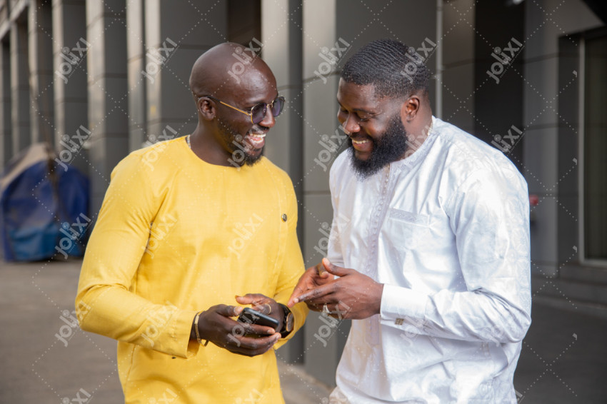 Deux hommes africains souriants tenant un téléphone en pleine rue