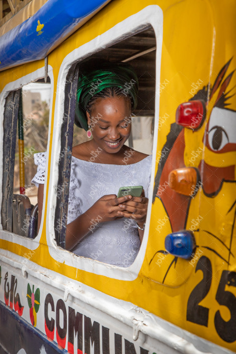 Femme africaine souriante manipulant son téléphone assises dans un mini car