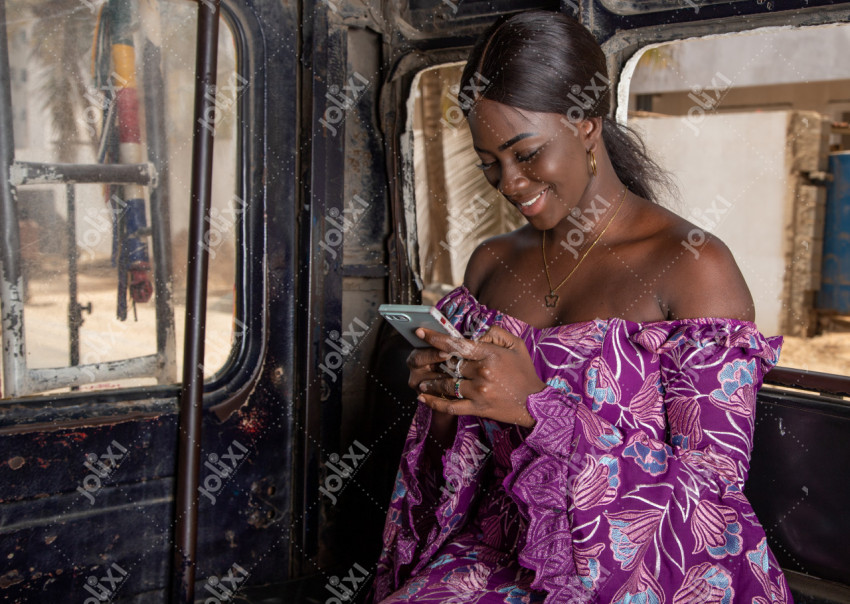 Femme africaine souriante manipulant son téléphone assises dans un mini car