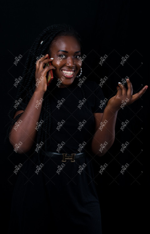 Belle femme africaine en pagne traditionnel célébrant sa victoire au téléphone