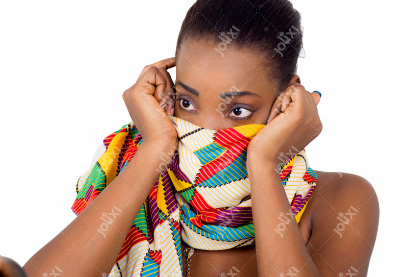 Regard fixe d'une jeune femme africaine voulant camoufler son visage.