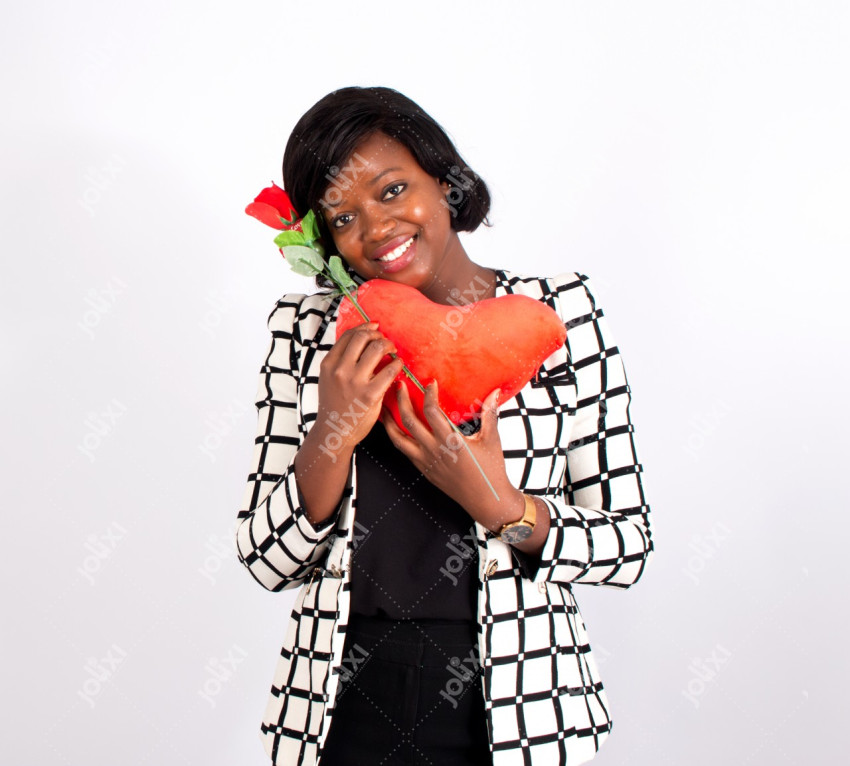 Belle femme africaine heureuse avec un cœur et une rose en main