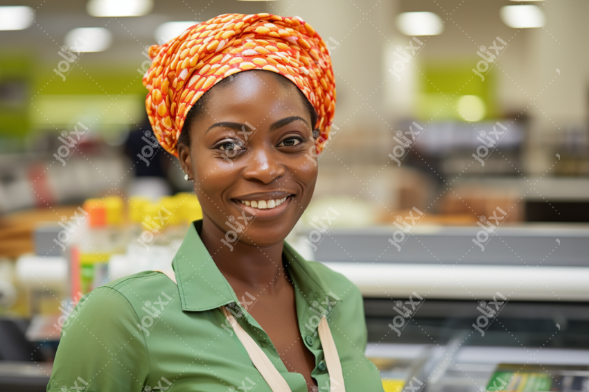 Belle femme africaine professionnelle souriante a la caisse dans un supermarché attachant un foulard
