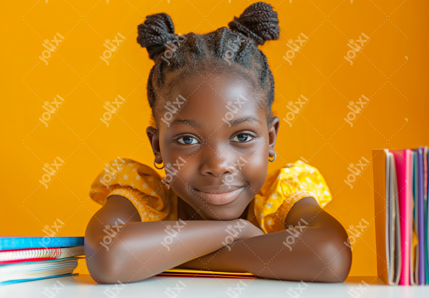 Jeune Écolier Africain souriant avec des dreadlocks et ses cahiers sur un fond orange