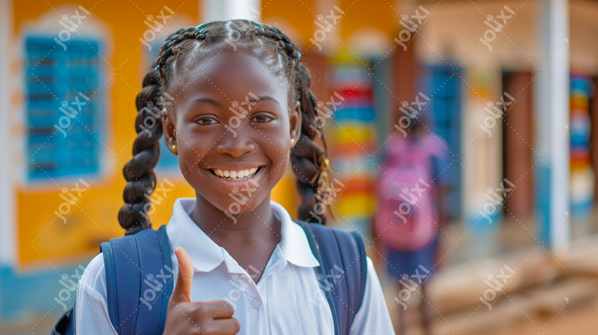 Collégienne africaine en tenue scolaire tenant ses cahiers et montrant son pouce