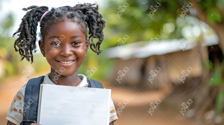 Collégienne africaine en tenue scolaire tenant ses cahiers et montrant son pouce
