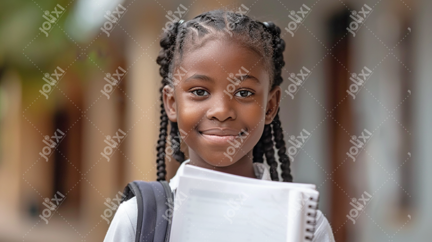 Belle écolière africaine souriante en uniforme scolaire tenant son cahier