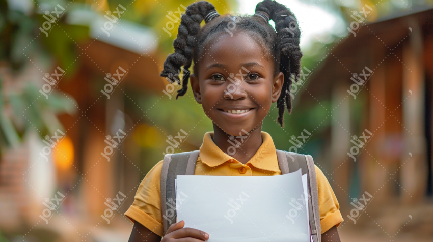 Une écolière Souriante tenant une feuille de papier avec Sac à Dos au Collège