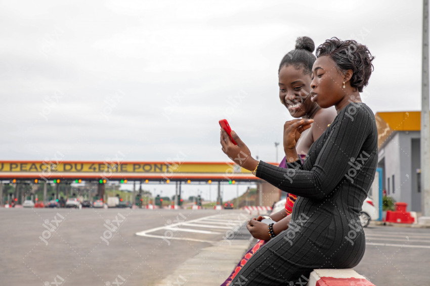 Moment de complicité et de joie en plein air entre les filles avec leur smartphone