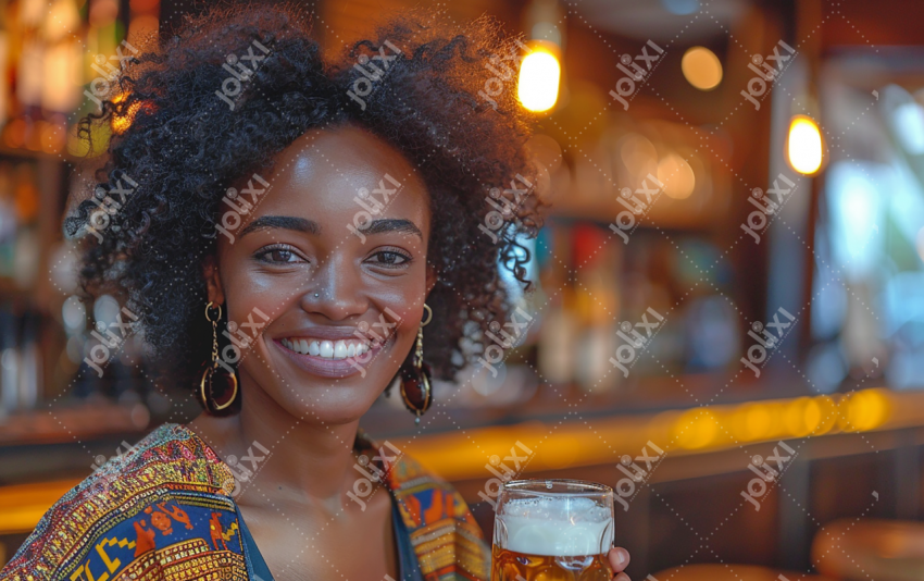 Jeune Femme Africaine Souriante avec un Verre de Bière dans un Bar