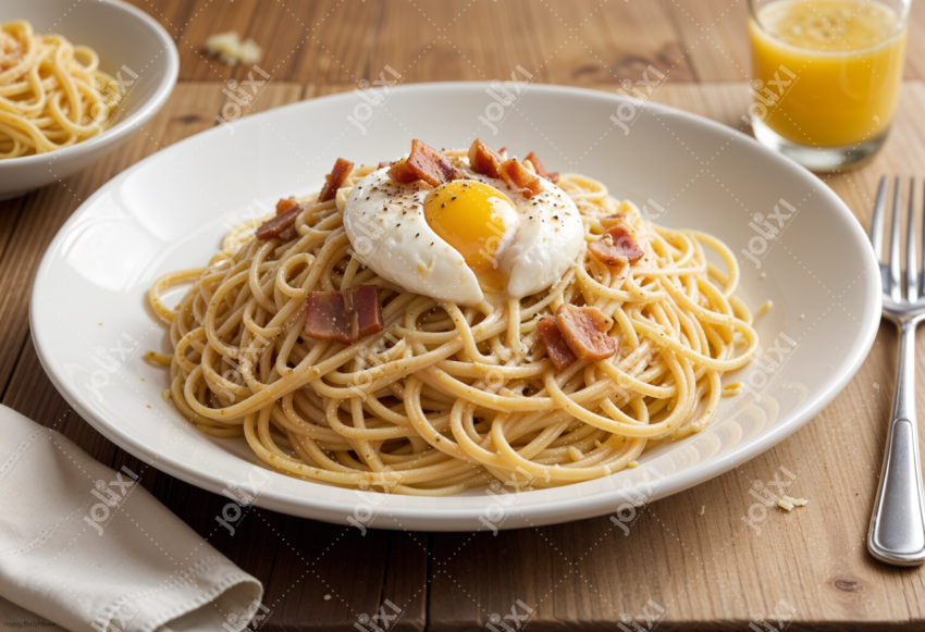 Spaghetti carbonara revisité : œuf coulant et bacon croustillant