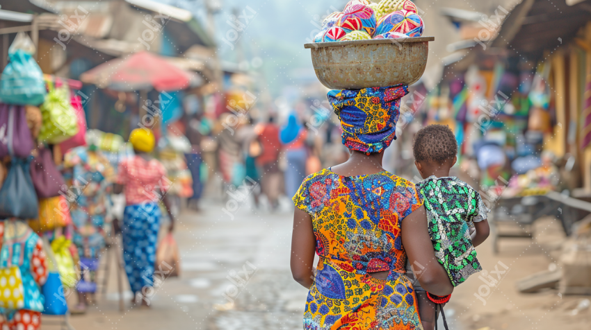 Femme Africaine Portant Son Enfant et des Marchandises dans un Marché Coloré