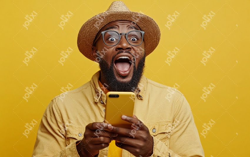 Homme africain professionnel exprimant une joie intense en découvrant un message sur son smartphone