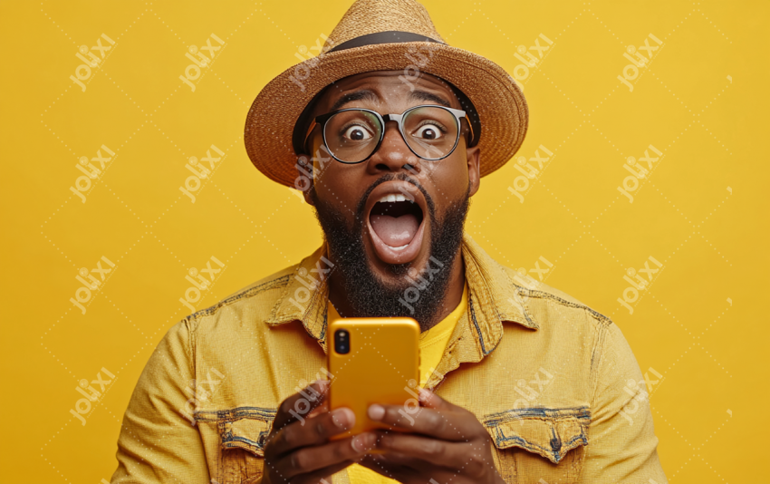 Jeune homme africain étonné tenant son smartphone sur un fond jaune