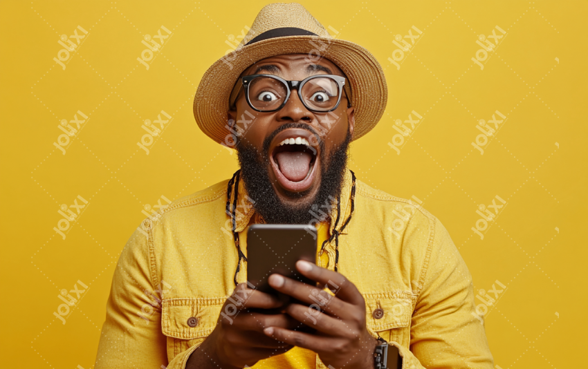 Homme Africain Excité Regardant Son Smartphone Avec Surprise et Enthousiasme