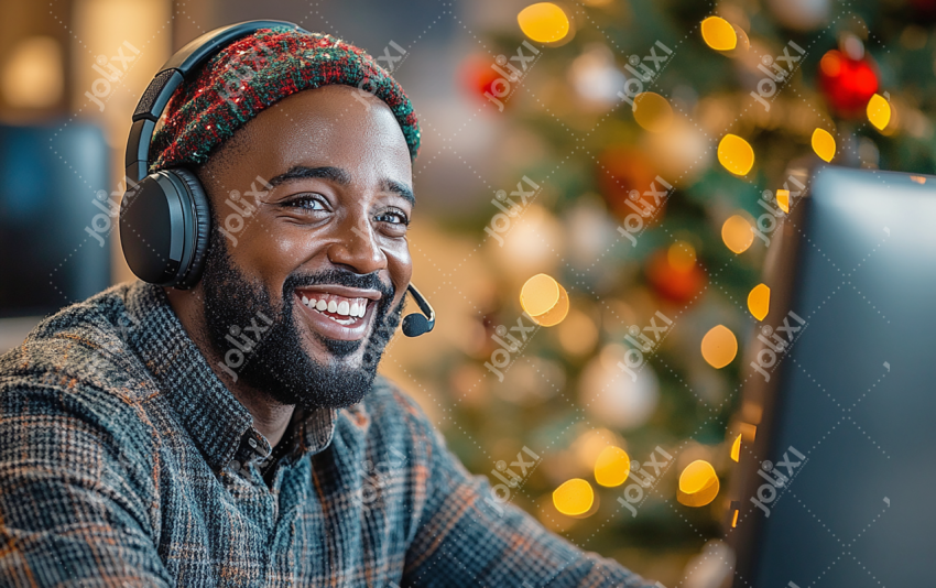 Téléopératrice Africaine Souriante en Plein Esprit de Noël