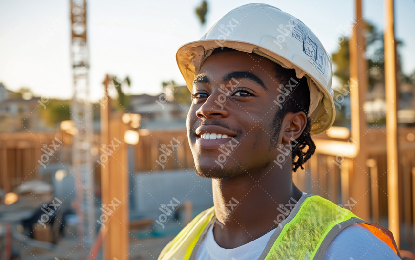 Homme Mature Africain Souriant avec Casque sur un Chantier en Construction