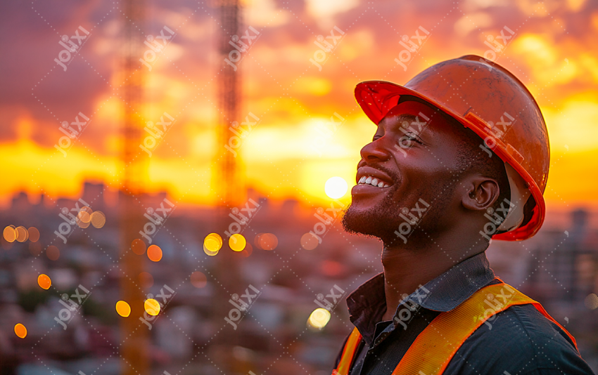 Homme Africain Souriant avec Casque avec le soleil se couchant en arrière