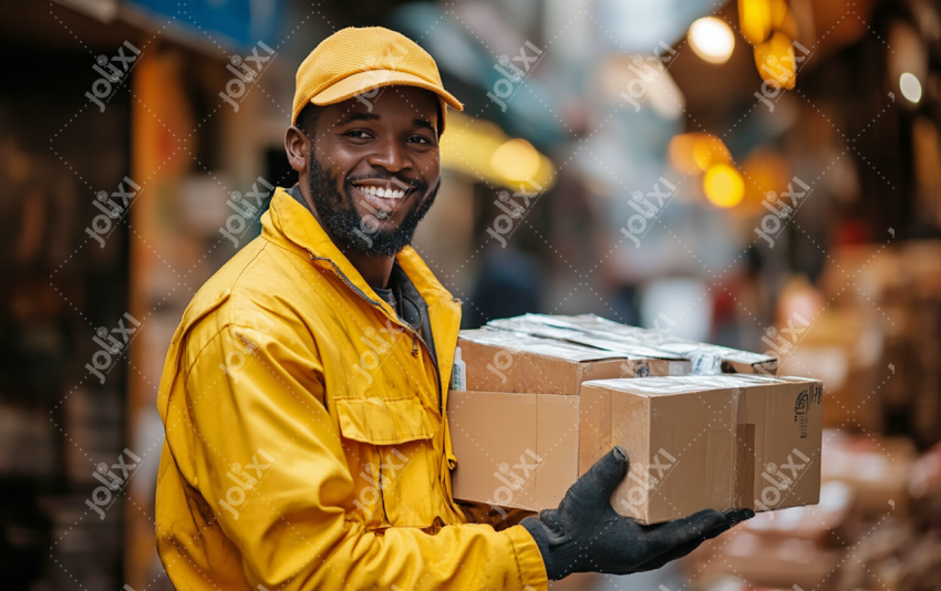 Livreur Africain Souriant Tenant un Colis dans une Rue