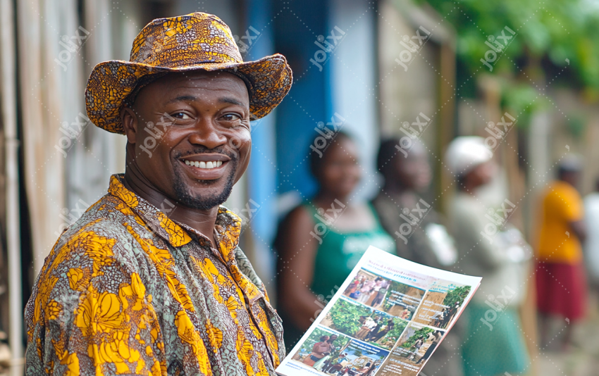 Homme africain souriant tenant un journal dans un lieu animé avec fond flouté