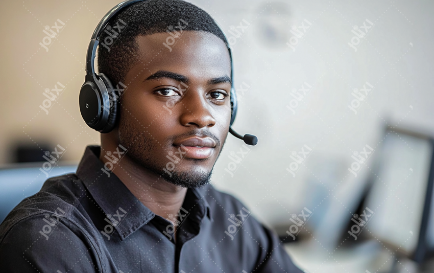 Professionnel connecté : homme africain confiant avec casque-micro