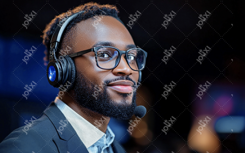 Homme Africain Souriant avec Casque avec le soleil se couchant en arrière