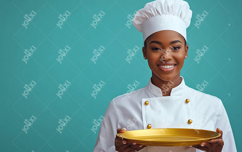 Femme Africaine Tenant la Vaisselle en main sur fond coloré