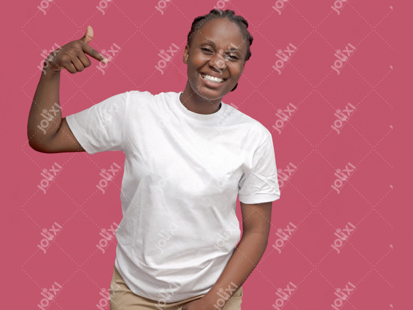 belle femme africaine portant un polo blanc faisant un signe de victoire