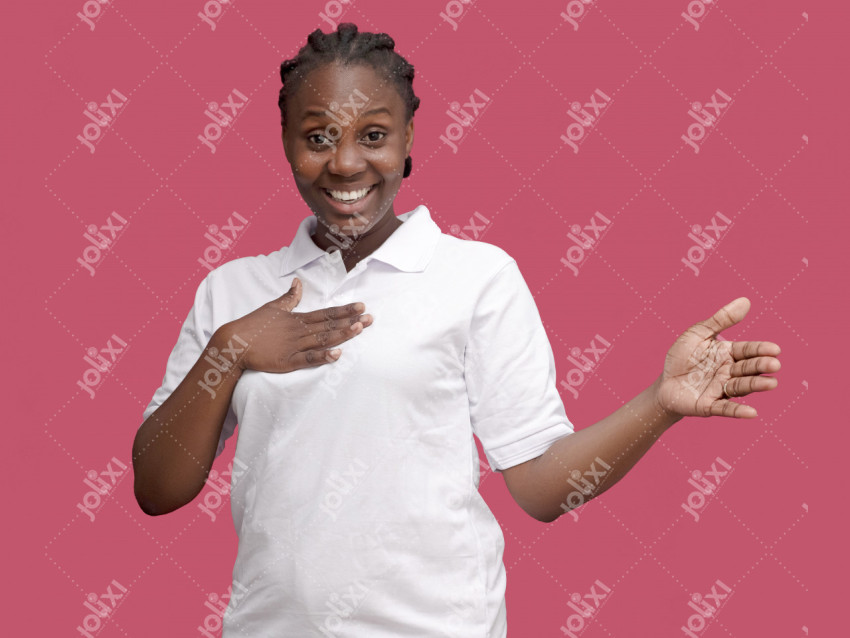 belle femme africaine portant un polo blanc faisant un signe de victoire