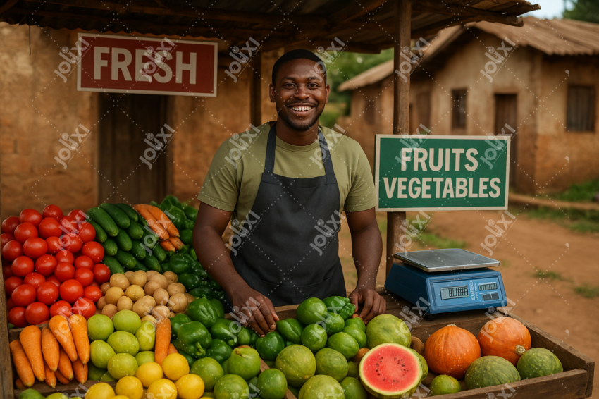 Jeune homme souriant et étonné, portant un boubou bazin et un bonnet, manipulant un ordinateur