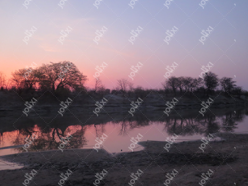 Nata village at sunset, Central Botswana (near Makgadikgadi Pans and Francistown). River Nata in spring. Southern African skyline at sunset.