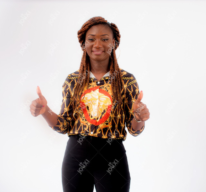 Jeune femme africaine souriante faisant un geste sur un fond gris