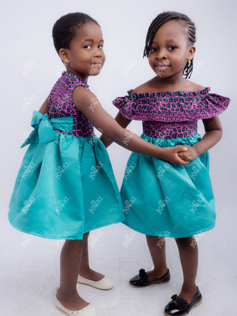 Deux femmes africaines souriante dansant en tenue traditionnel sur un fond beige